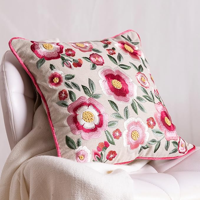 Decorative Embroidered Cushion Cover | Knitted Chambray Front Throw Pillow Cushion Cover for Sofa Living Room | 16inch x 16inch | Pink Floral